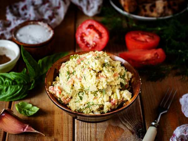 Сладкий перец очистите от семян и нарежьте вместе со свежим огурцом на небольшие кубики. Добавьте овощи в общую массу, перемешайте. Добавьте измельченный чеснок.