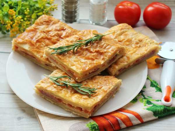 На стол пиццу из слоеного теста с курицей подавать в горячем виде!