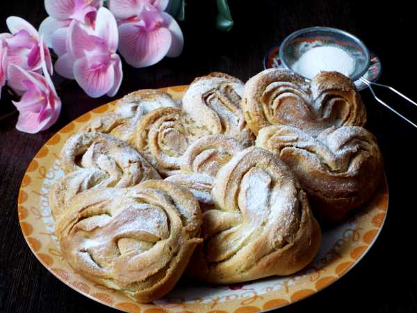 Разделить тесто на 7 равных частей. Каждую часть теста раскатать в овал. Смазать тесто маслом с помощью кисти и присыпать сахаром с ванилью. Я соединила 100 грамм сахара и 10 грамм ванильного сахара.