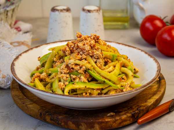 Соберите продукты для приготовления бризолей из кабачков с фаршем. Фарш у меня куриный, который я самостоятельно приготовила в блендере вместе с луком. С ним, считаю, бризоли получаются более нежными и запекаются быстрее.