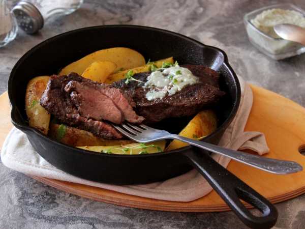 Убавьте огонь до минимума и жарьте свинину по 4 минуты с каждой стороны. Сковороду накрывать крышкой не нужно. Проколите мясо ножом или вилкой. Если сок, который выделится, будет светлым, то бифштекс готов.