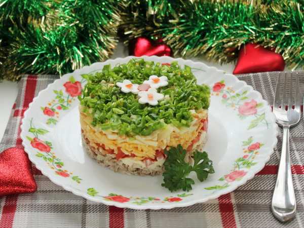 Декорируем салат непосредственно перед подачей. Из перьев зеленого лука и зубочисток сделаем подобие мачты (не забудьте только гостей предупредить о наличии зубочистки).