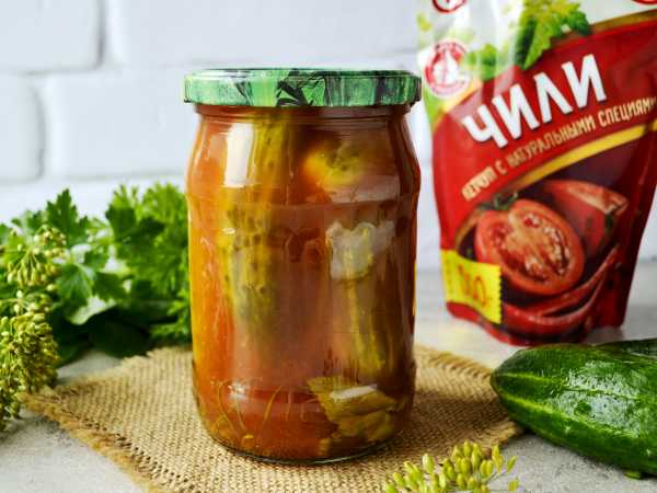 Маринованные огурцы с кетчупом чили без стерилизации на зиму готовы.