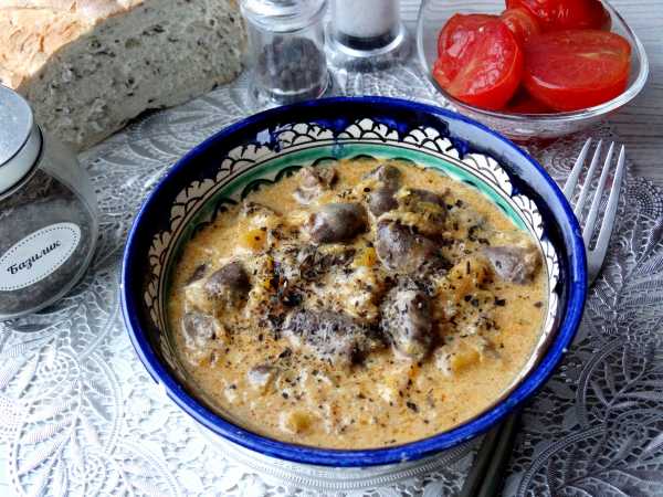 Тушите макароны с куриными сердечками 15 минут под крышкой на медленном огне, иногда помешивая. Блюдо готово!