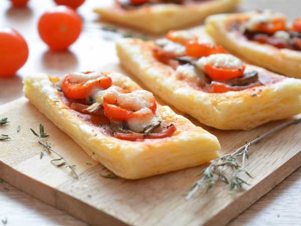 Нарежьте пластины теста длинными треугольниками, срезая боковые части. Если вы самостоятельно приготовили домашнее слоеное тесто, то раскатайте его в 0,5 см толщиной и вырежьте длинные треугольники. Нанесите ложкой или силиконовой лопаткой на широкую часть топпинг или другую начинку.