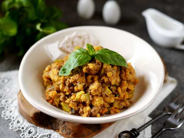 Затем выложите говядину с красной чечевицей на тарелки и подайте к столу теплой вместе со вкусными соусами, салатами.