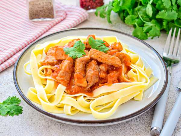 А пока свинина тушится, отварите пасту мафальдине в большом количестве воды с добавлением соли. Отваривайте до состояния аль-денте, поскольку паста будет ещё готовиться в соусе.