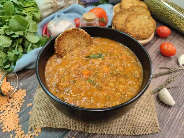Влить воду или овощной бульон. Довести суп до кипения. Добавить специи по вкусу. Варить на умеренном огне 40-45 минут.