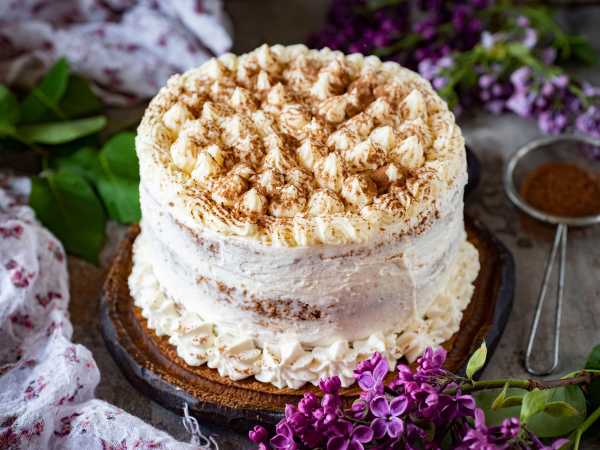 Накрываем следующим коржом, повторяем слой крема, ягоды малины. И так до последнего коржа. Его оставляем просто с кремом, без ягод. Бока также обмазываем кремом.