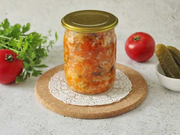 Горячий салат выложите в стерилизованную банку и закрутите стерилизованной крышкой. Переверните вверх дном, закутайте в одеяло и держите в нем до полного остывания банки.