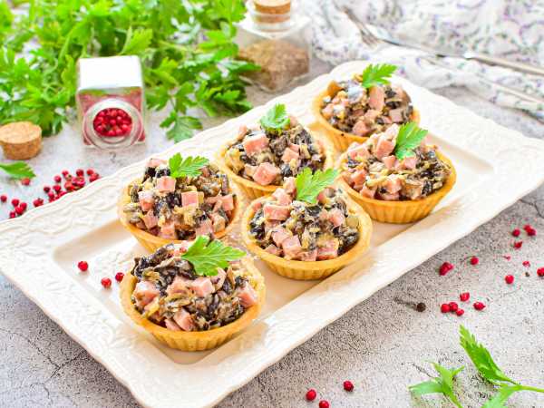 Украсьте на свой вкус и сразу подавайте к столу - тарталетки с курицей, грибами и ананасами готовы.