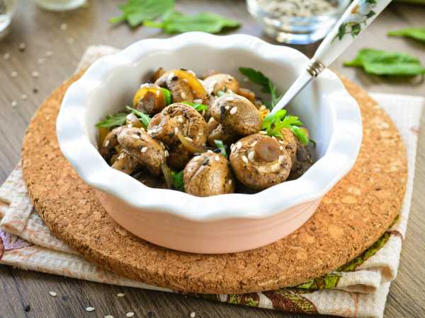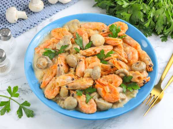 Соберите ингредиенты для приготовления грибов с креветками в духовке.