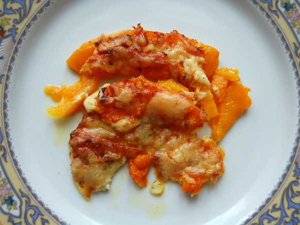 Достаньте тыкву из духовки, положите сверху кусочки нарезанного сыра.