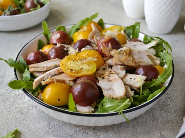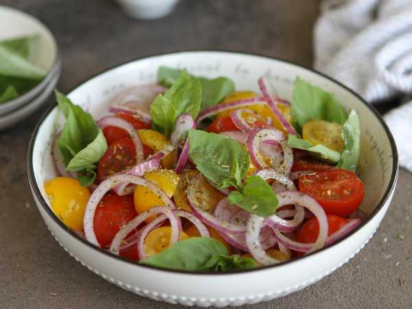 При этом нарезка овощей в салате не будет играть большую роль. Огурцы с помидорами можно нарезать, например, еще крупным кубиком. Главное, не сильно мельчить овощи, так как помидоры могут дать много сока.
