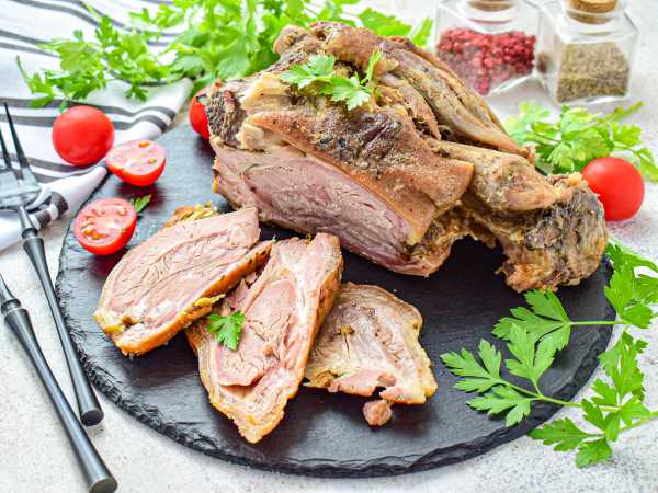 Готовую рульку подавайте горячей. По желанию можете украсить зеленью и свежими овощами.