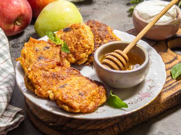 Дополните яблочные ПП оладьи сметаной и угощайтесь. Приятного аппетита!