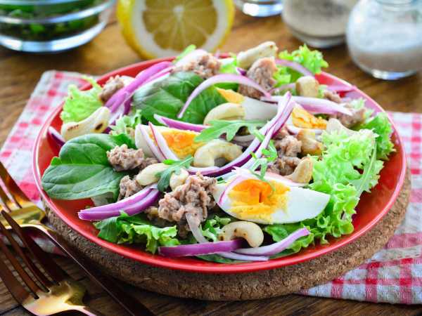 Готовый салат из тушенки тунца сразу же подаём к столу!