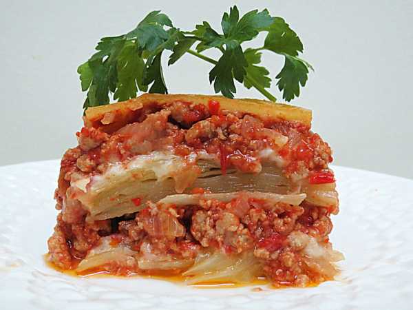 Готовую лазанью нарезать на кусочки и разложить по тарелкам. Подать в горячем виде.