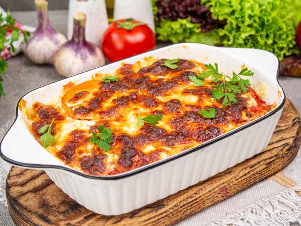 Накрыть форму фольгой и убрать в разогретую духовку. Запекать лазанью из баклажанов с фаршем в духовке примерно 40-45 минут при 180 градусах.