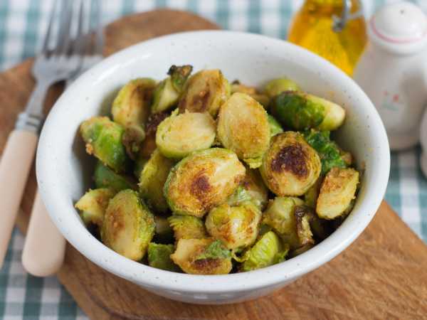 Чашу промыть, обсушить. Растопить в ней кусочек сливочного масла и слегка обжарить брюссельскую капусту.