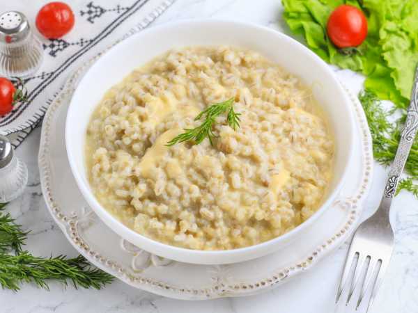 Как только перловка будет готова, добавляем кусочек сливочного масла и сыр.