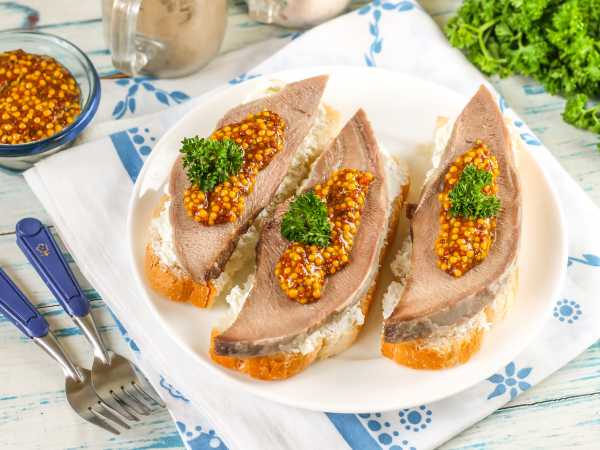 Нарежьте багет или батон ломтиками. Подсушите их в духовке или на сковороде примерно 3-5 минут. В духовке они подсушиваются чуть дольше, но зато получаются хрустящими и ломкими. Я рекомендую смазать их растительным маслом с одной стороны - оно придает румяности тостам. Остудите ломтики багета и выложите их на тарелку.