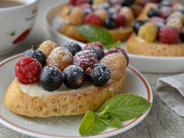 Чиабатту нарежьте тонкими ломтиками и обжарьте по минутке-две с каждой стороны на сухой сковороде. Сильно обжаривать хлеб не нужно, а лишь его подсушить. Также можно его подсушить в тостере, на гриле, духовке или в аэрогриле.