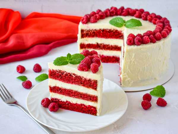 А вот такой разрез у торта «Красный бархат» с вишней.