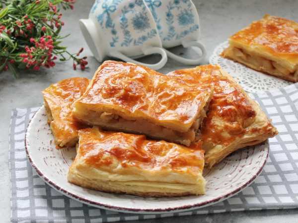 Готовое к работе тесто раскатайте в прямоугольник. Немного отступая от края теста, выложите на него приготовленные на сковороде груши.