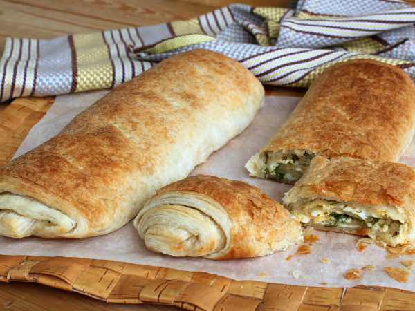 И сверните тесто с начинкой рулетом. Выложите рулет в форму для запекания.