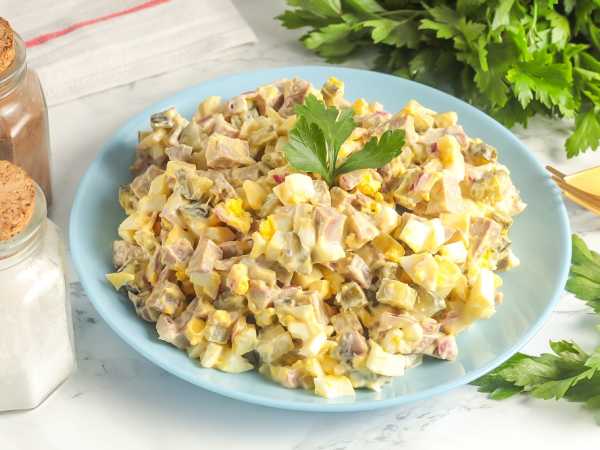 Из хвостиков красного перца делаем корону, нос и язык. Украшаем салат петрушкой.
