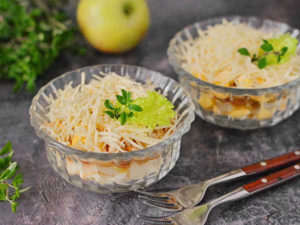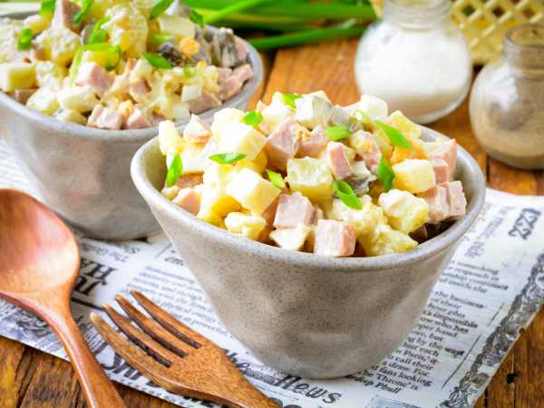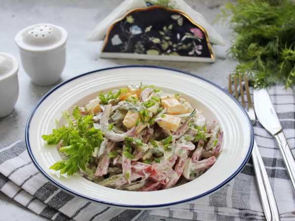 Все ингредиенты в этот салат нарезаются либо мелким кубиком, либо тонкой соломкой.
