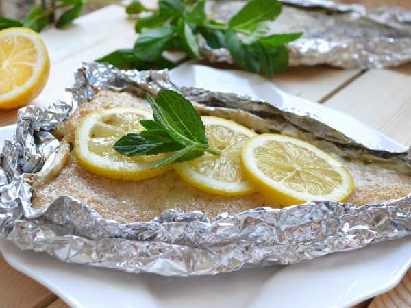 Выложите на противень с фольгой. Заверните в фольгу так, чтобы она не касалась поверхности рыбы. В противном случае в процессе запекания фольга может прилипнуть к шкурке.