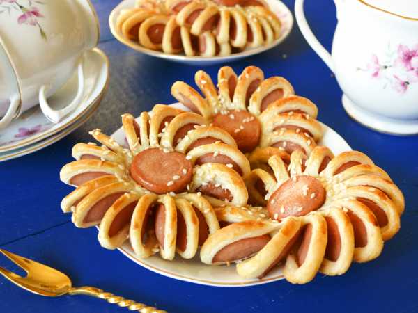 Из болгарского перца или помидора вырежьте язычки змеям и вставьте их в голову слойки. Переместите румяных змей с сосисками на блюдо и подайте к столу горячими или теплыми. Особенно вкусны они с различными соусами.