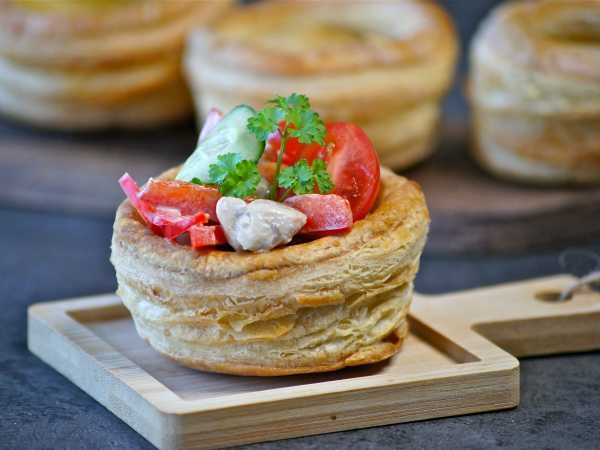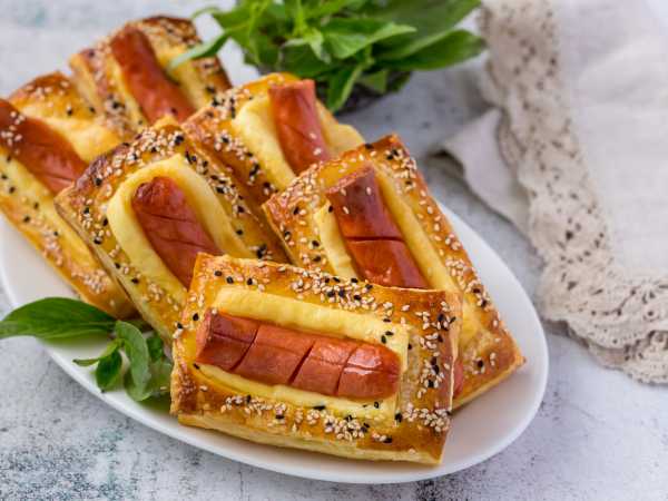 Запекайте слойки примерно 15-20 минут, затем смажьте желтком по всей поверхности теста. Дозапеките еще 3-5 минут, до румяности.