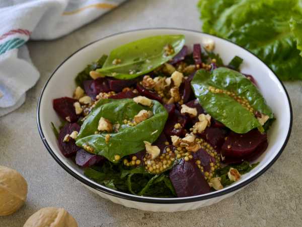 Посыпьте салат зернами граната и выложите грецкие орехи.