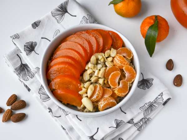 Разложите нарезанную хурму по кругу, мандарин и посыпьте боул с овсянкой слегка измельченным миндалем.