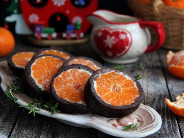 Выкладываем мандарины и начинаем закручивать рулет. Рулет ставим в холодильник на 10-15 минут.