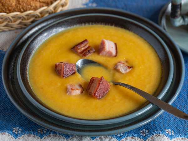 Чтобы суп-пюре дольше оставался горячим, подогрейте тарелку для подачи, налив в неё ненадолго кипяток. Затем кипяток вылейте, а в тарелку налейте сырный крем-суп с беконом.