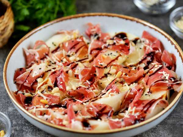 200 г маслин разрезаем пополам и выкладываем внешний контур салата.