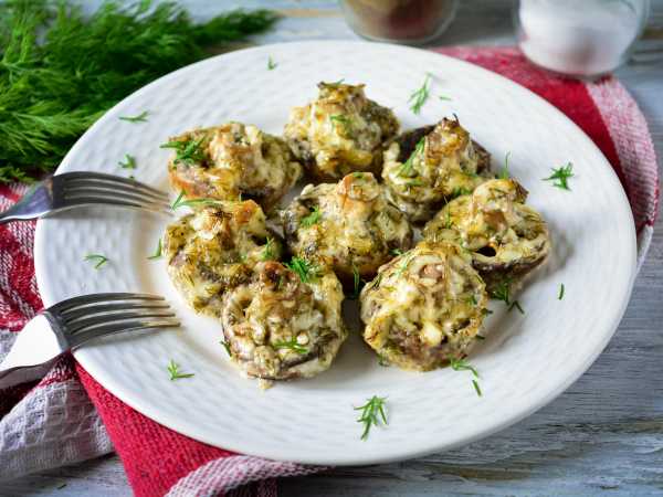 Шляпки шампиньонов наполните гречневой начинкой и выложите на противень или в другую форму для запекания.