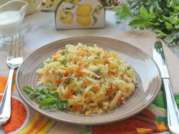 Добавьте ее в сковороду. Продолжайте обжаривать овощи на среднем огне, периодически помешивая. В процессе жарки капуста начнет терять объем и будет немного зажариваться. Влейте 40-50 мл теплой воды, закройте сковороду крышкой и томите капусту на медленном огне еще примерно 20 минут.