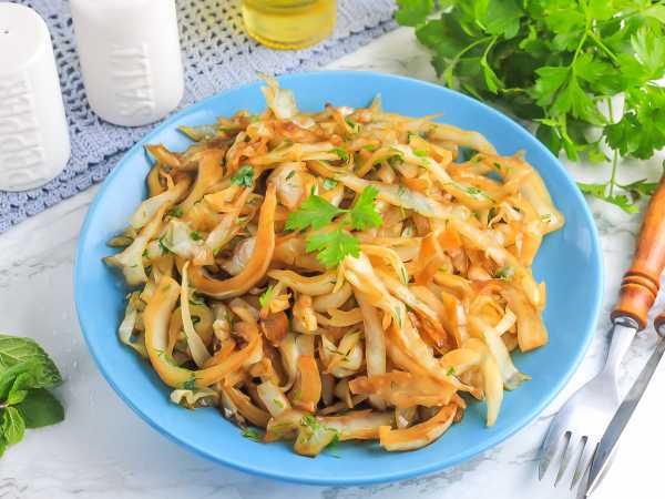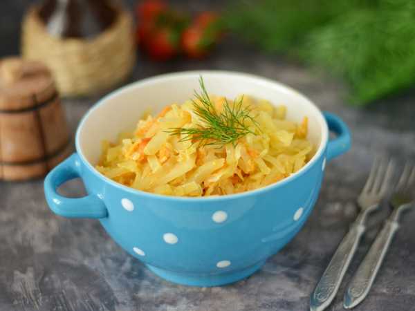 Снова накройте сковороду крышкой. Тушите капусту еще 3-4 минуты и выключайте плиту.
