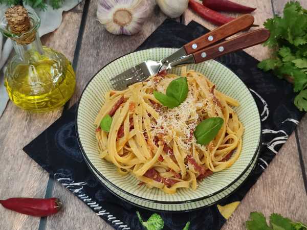 Сразу же добавьте отварные макароны, перемешайте и готовьте не более 1 минуты. Попробуйте блюдо на соль, перец и при необходимости добавьте.
