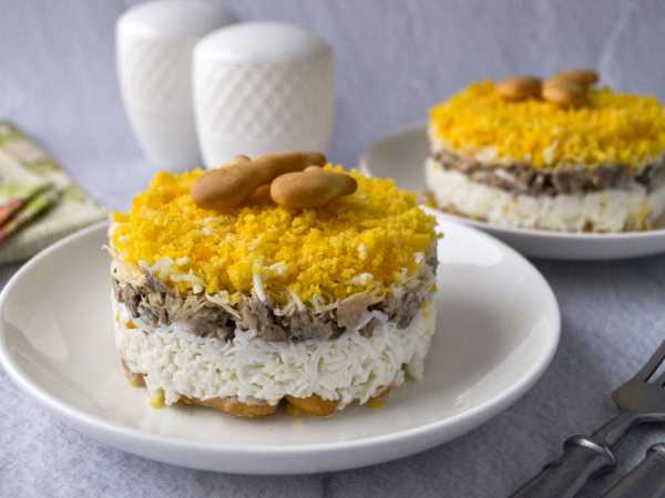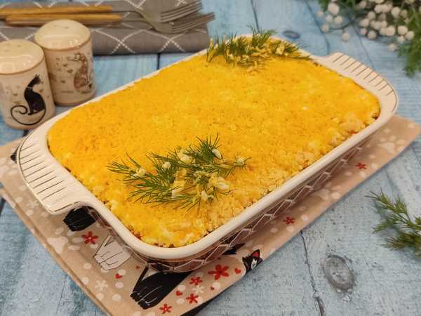 Верх салата оформим натертыми желтками. Салату хорошо бы пропитаться в холодильнике пару часов. Не забудьте прикрыть его аккуратно пленкой, чтобы желтки не подсохли.