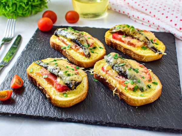 Разогрейте духовку до 220°С. Поместите в неё противень с бутербродами и запекайте их до расплавления сыра. У меня на это ушло 5 минут.