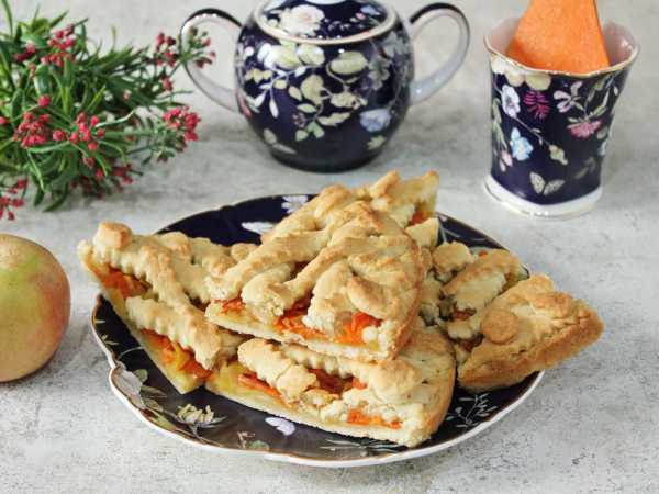 Песочный пирог с творогом, тыквой и яблоками готов. Остывший пирог нарежьте и подавайте к столу.