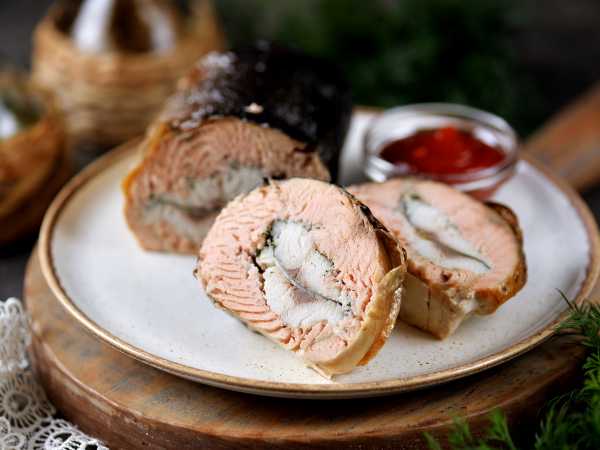 Начиная с широкого конца, сверните филе с начинкой в рулетики и зафиксируйте зубочисткой.