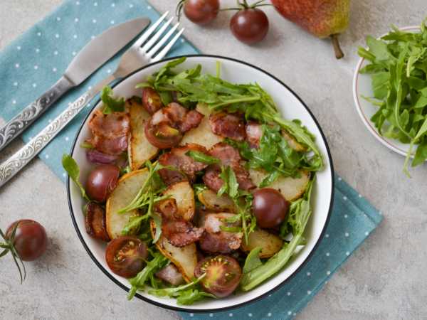 Картофельный салат с беконом подавайте к столу, дополнив его любой зеленью.