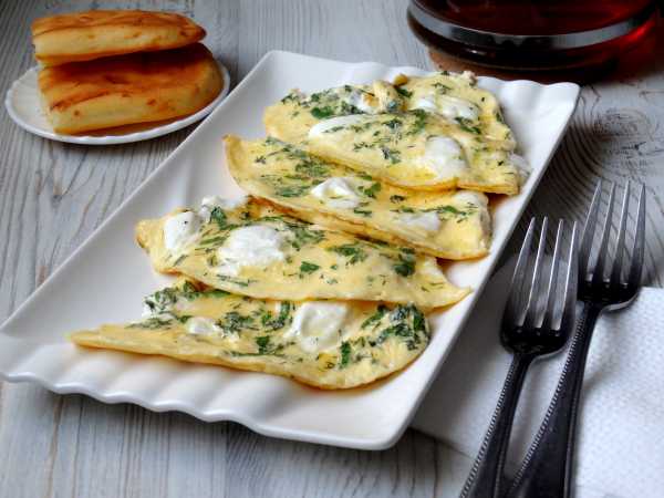 Готовый диетический белковый омлет аккуратно снимите со сковороды вместе с пергаментом, а затем отделите лопаточкой от пергамента, сложите вдвое и переложите на тарелку.